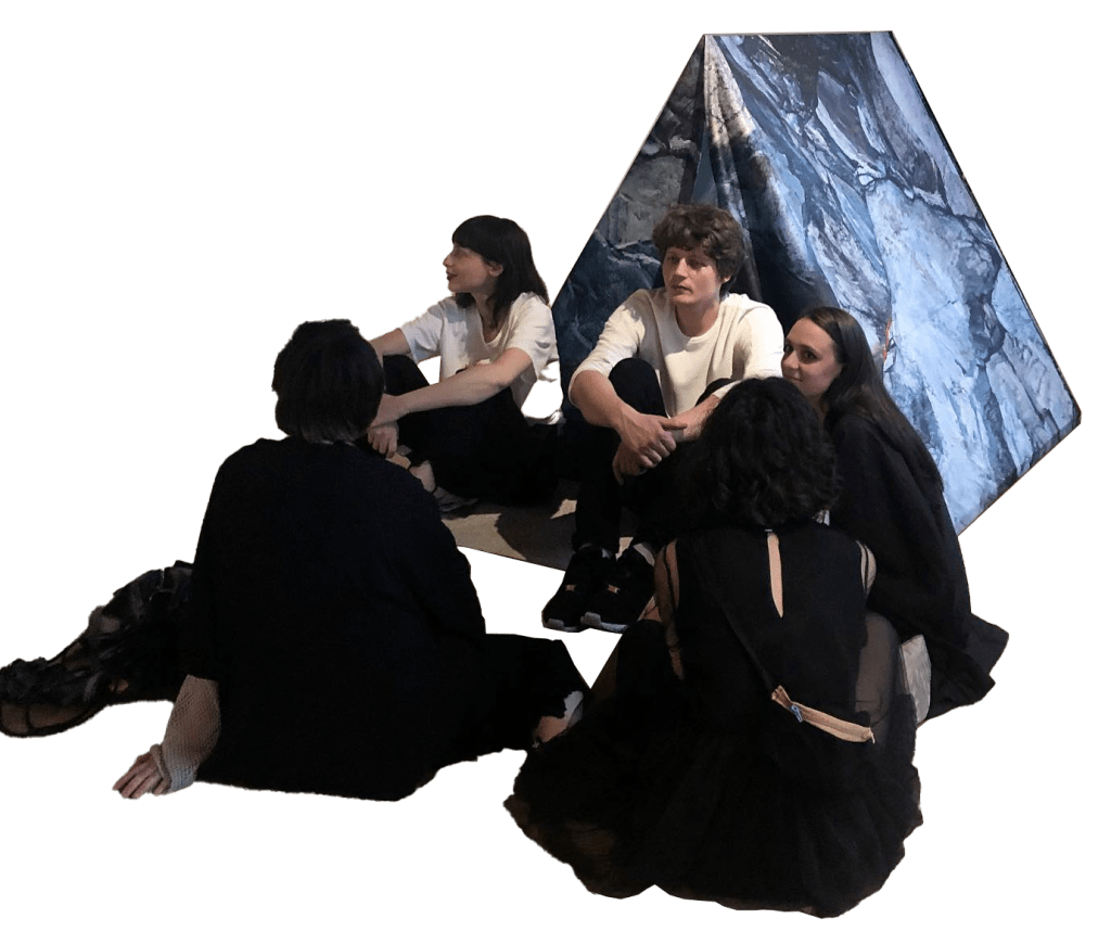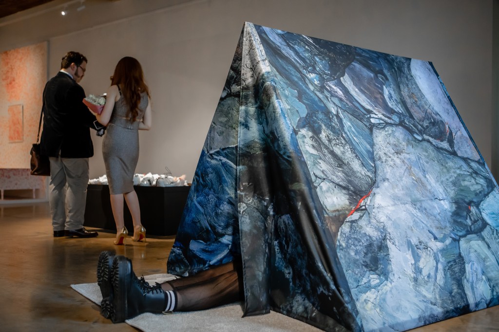 To feel more secure, I build myself a shelter, a secluded corner. A tent is, on the one hand, a temporary shelter, on the other, a house that you carry with you. The house is most often intimate, sincere and kind (at least I would like to believe so). So I show myself to myself, here – I have a “place” in art. The fabric is covered with a print on the outside: painting is something that grows through any my work, which makes the boundary between me and contemporary art and at the same time is a point of contact. Here is the contact.