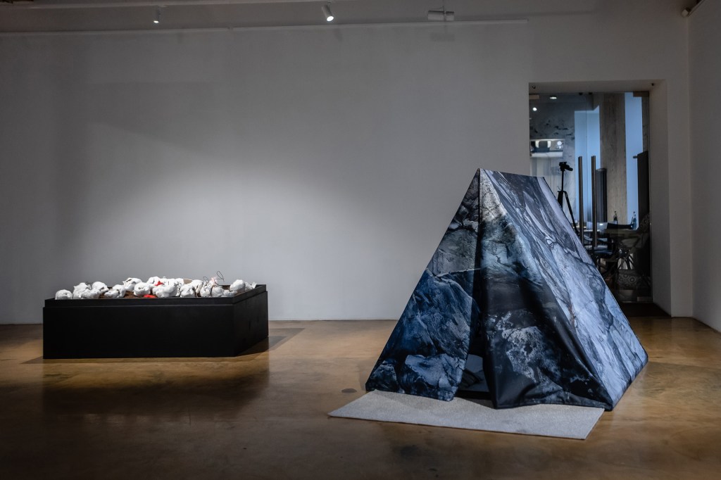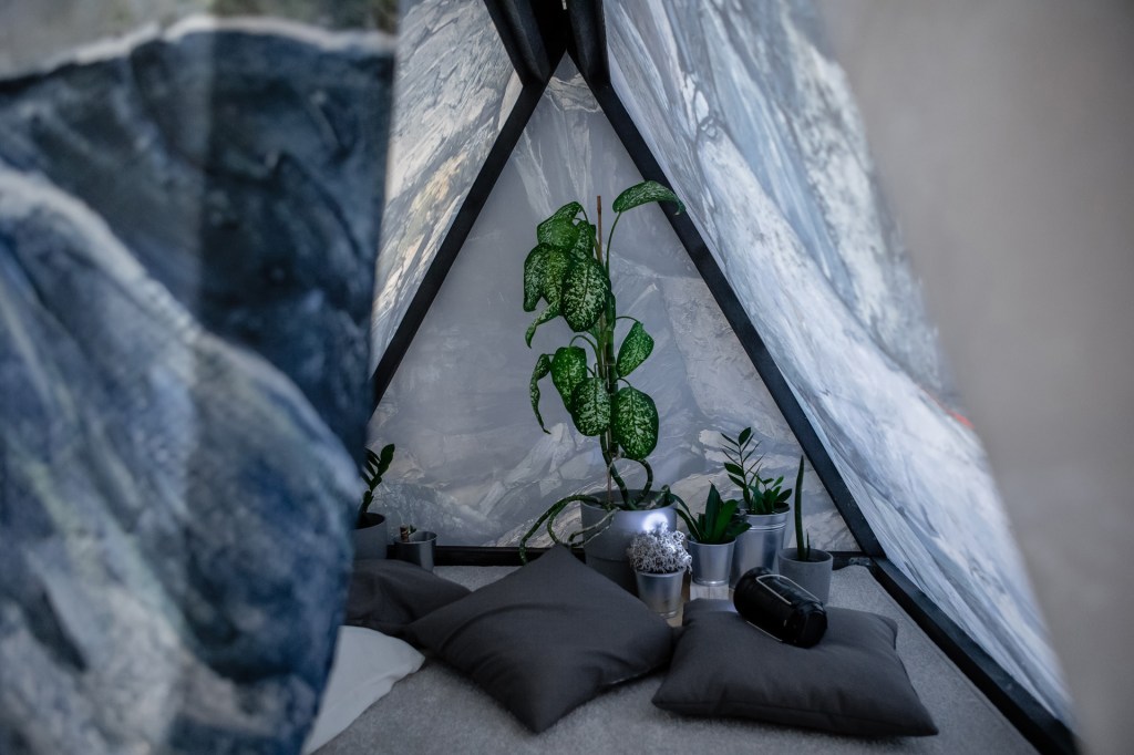 Frame made of timber, printed fabric, the tent is filled with the artist’s personal items (plants, rugs, lanterns and pillows) with a touch of hotel vibe. 150x150x150 cm + a doormat