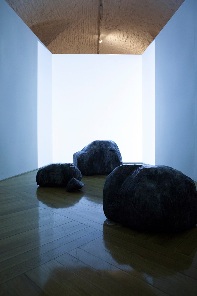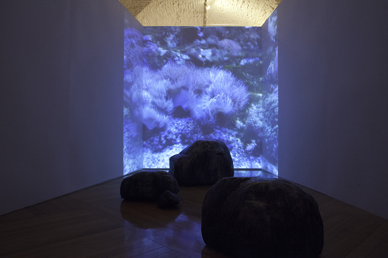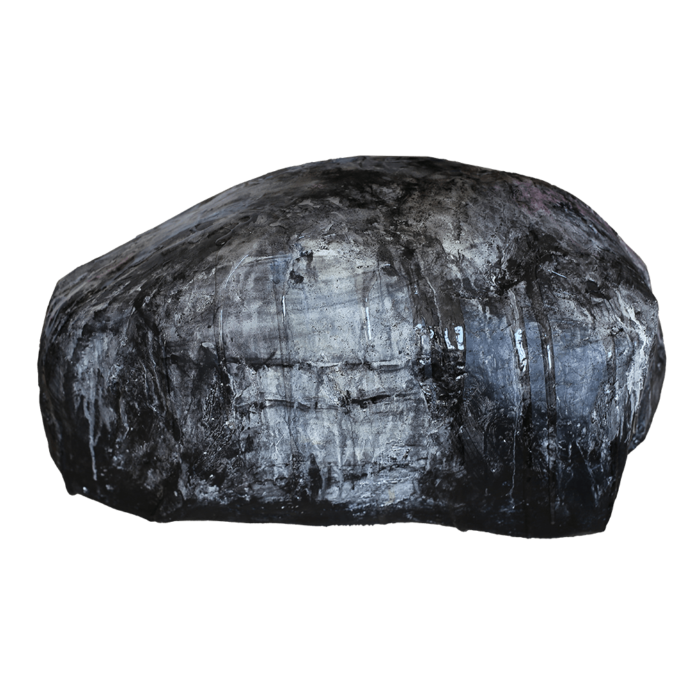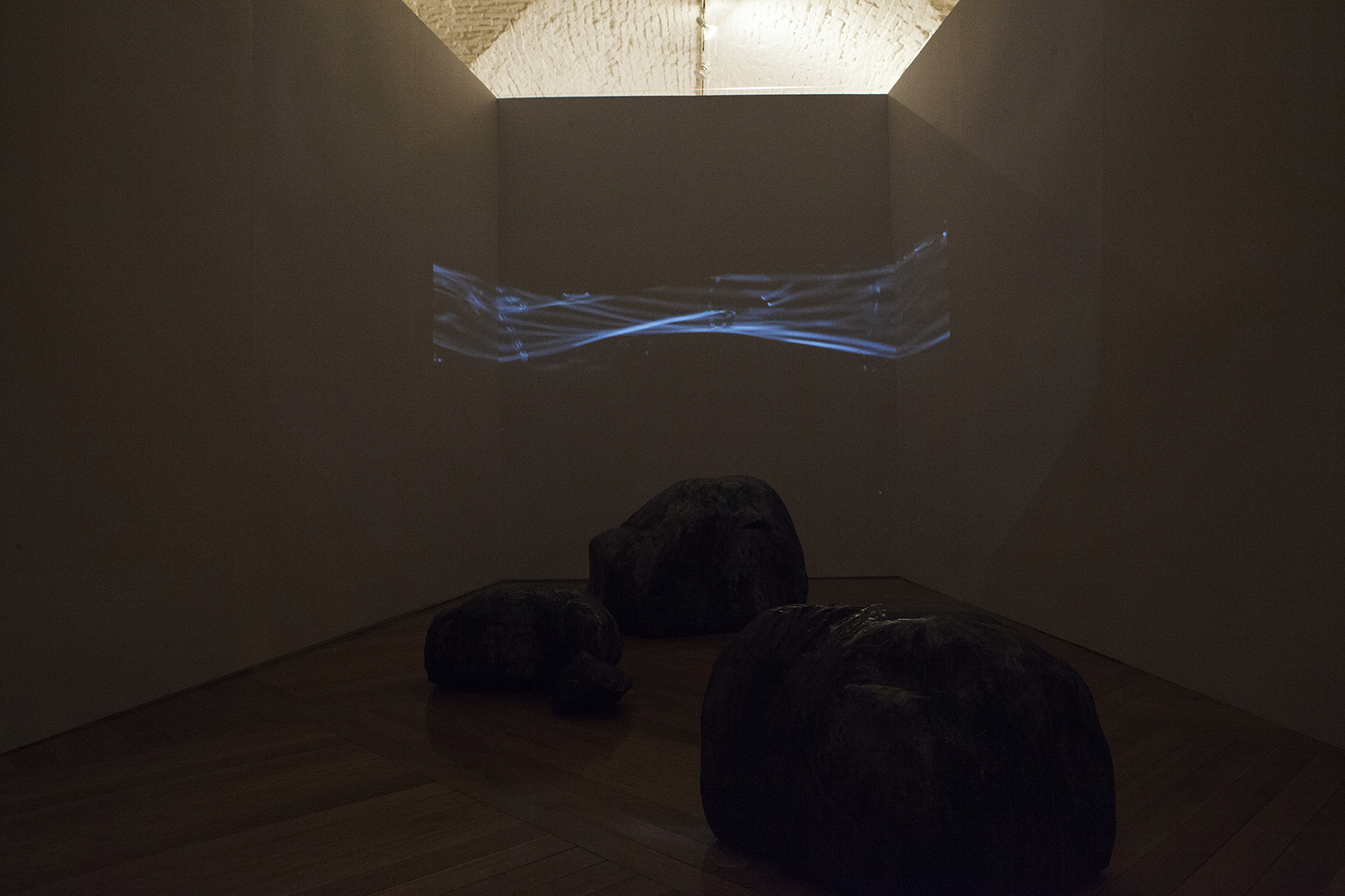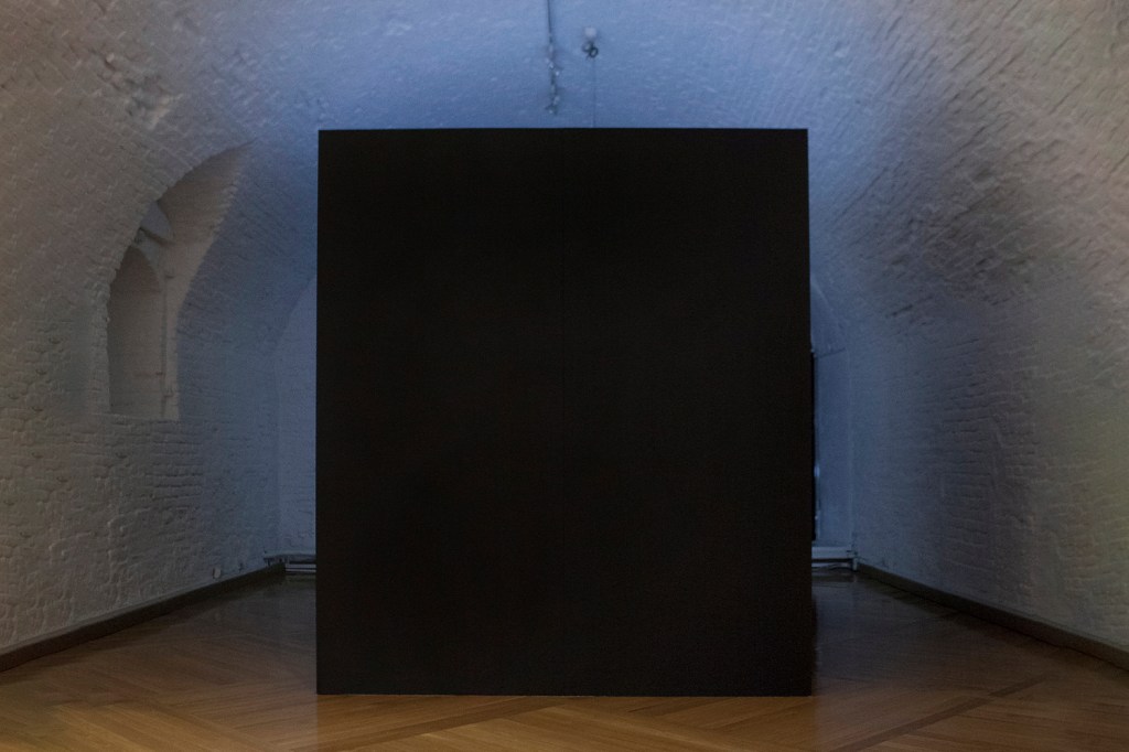 A trapezoidal U-shaped structure made of plywood and timber, 450×225 cm in size. A solid wall faces those entering the hall looking like a black cube from the outside. A video is projected inside: the gradual filling of the space with water, shot down from time to time into frames-memories. There are several stone sculptures inside. The size of the largest is approximately 100x120x60 cm, there are small ones: 20x20x30 cm. Materials: foam, paper, primer, putty, acrylic, liquid transparent plastic. Outside, printed papers with quotes from the artist’s working correspondence are pasted on the walls of the room itself. The whole space is filled with sound, which amplifies the tension during the “flooding”.